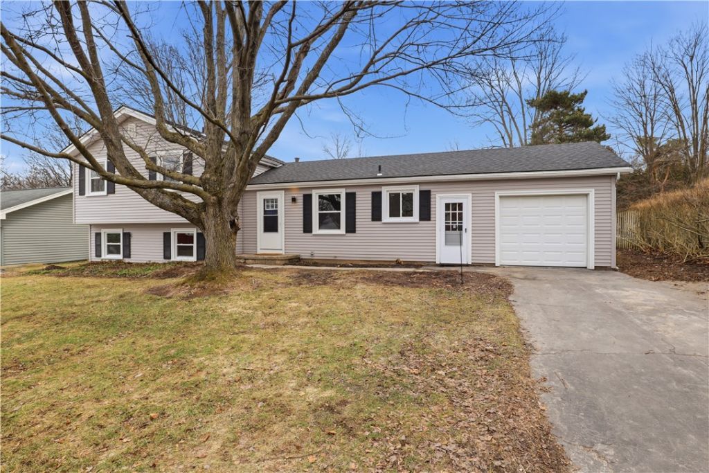 Beautifully updated 4 bedroom, 2 full bath home backing up to town-owned land in convenient Henrietta neighborhood. Thoughtful, modern design throughout with an open-concept floor plan on the main floor. Luxury vinyl plank flooring provides easy maintenance and enhances the sunlight pouring through the windows, which are brand new throughout the home. Great entertaining space with the family room and dining room overlooking the peaceful backyard and flowing to the island breakfast bar. The kitchen is completely new as well featuring white cabinets, granite counters and stainless appliances, which are included in the sale. Pantry for storage as well. Upstairs are 3 bedrooms and full bath with each bedroom having a double closet. Downstairs is an additional bedroom, stunning full bath and living room which has walk-out access to the back yard. Additional amenities include a clean basement for storage/laundry, large back yard, patio space and attached 1-car garage. With fresh paint, flooring, windows, fixtures and updated mechanicals, there's nothing left to do to enjoy this home for years to come!
